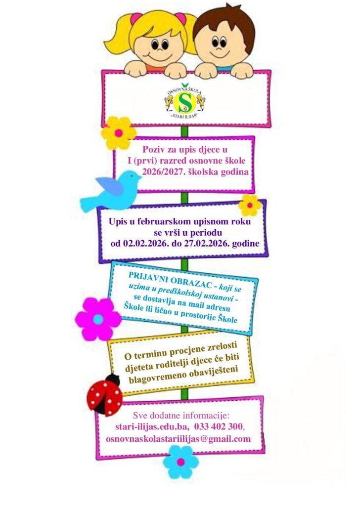 Poštovani roditelji/staratelji, Poziv za upis djece u prvi razred osnovne škole za školsku 2026/2027. godinu je na linku Februar_Poziv za